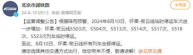 8月10日北京市郊铁路怀柔-密云线所有列车全部停运