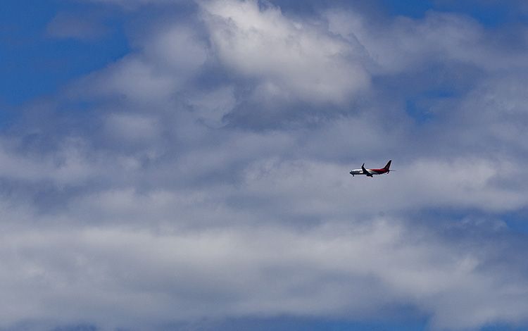 朝阳路,一架飞机飞过白云。