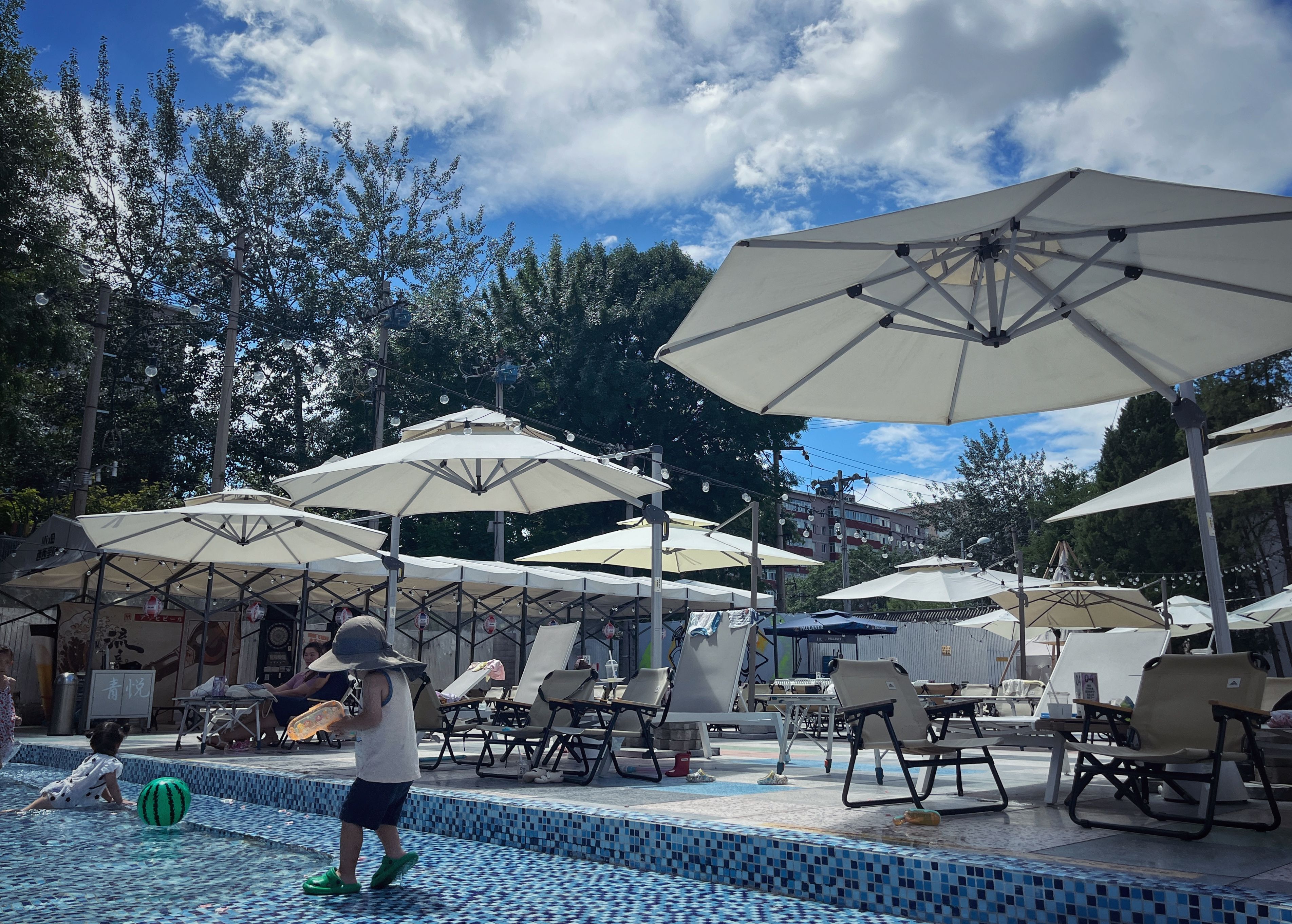 农展馆南路,孩子在水池嬉戏。