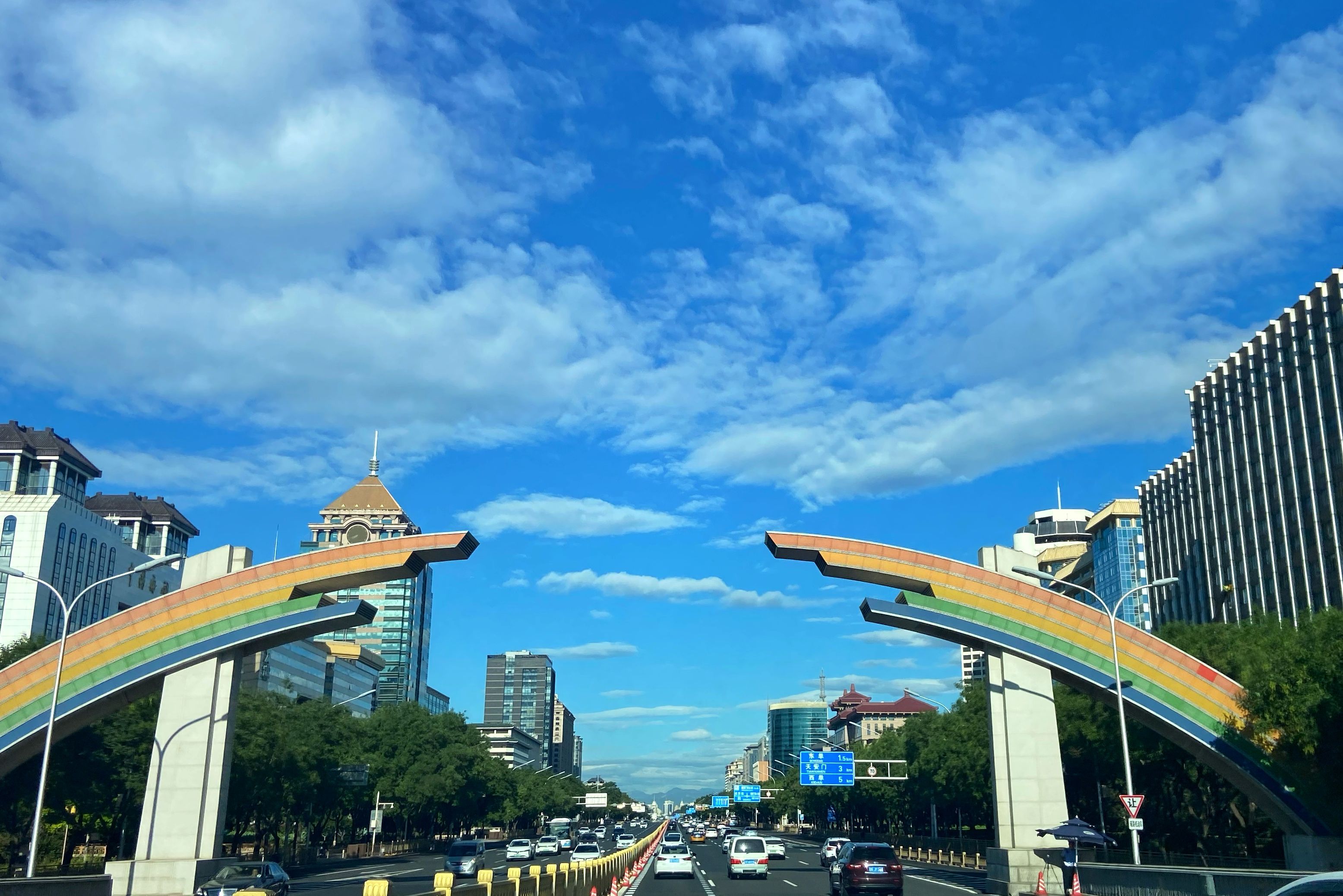 建国门向西拍摄的蓝天白云。