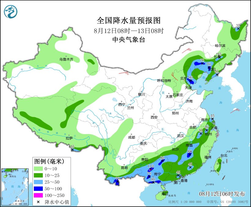 未来三天,东北地区雨势明显减弱,华北多雷阵雨天气。预计未来24小时,内蒙古东南部、河北东北部、北京东北部、天津北部、辽宁中西部和东南部、吉林中南部以及云南南部、安徽南部、浙江西部、江西东北部和中南部、湖南南部、广东北部和西南部、广西中北部和东南部沿海等地的部分地区有大到暴雨,局地有大暴雨(100~110毫米);辽宁西部和南部、河北东北部、天津中部、安徽西南部、江苏南部、湖南南部、江西中北部、浙江中北部、福建西北部等地的局地有雷暴大风或冰雹天气。