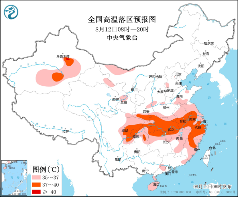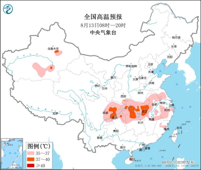 昨日,浙江绍兴、湖州、杭州、金华等局地气温达到40℃至42.3℃。浙江德清(41.6℃)、湖北荆州(39.4℃)突破建站以来日最高气温的历史极值。预计今天(8月12日)白天,吐鲁番盆地和南疆盆地东部、陕西南部、重庆、四川盆地东部、安徽中南部、江苏西南部、湖北、湖南北部、江西北部、浙江、福建北部等地部分地区最高气温仍有37℃以上,局地可达40℃。8月13日至14日,南方地区高温天气范围和强度继续减小。