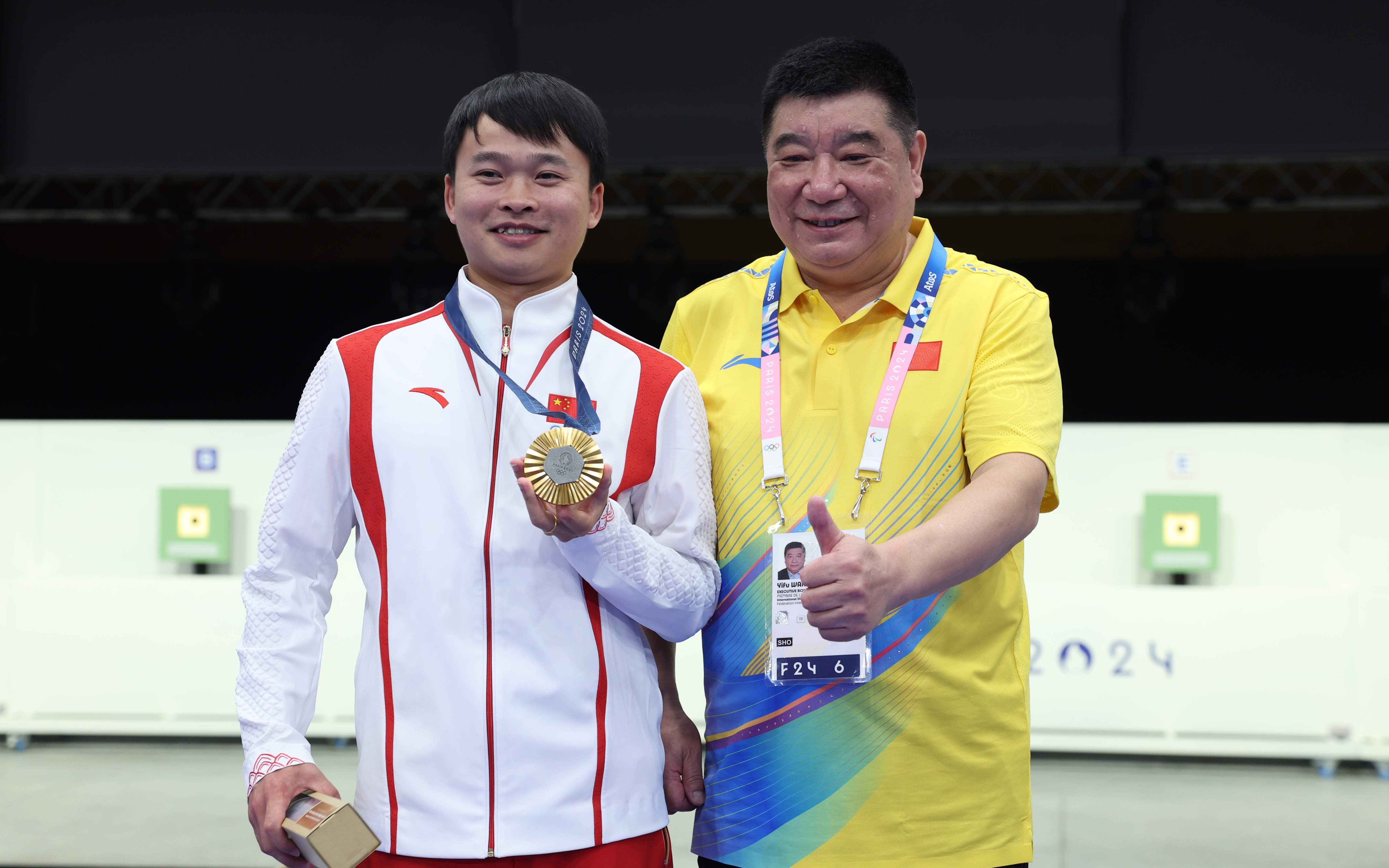 巴黎奥运会男子10米气手枪项目,谢瑜(左)夺冠后和中国射击名宿王义夫合影。 图/新华社