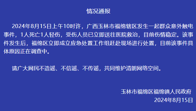 广西玉林发生一起群众意外触电事件,1人死亡1人轻伤