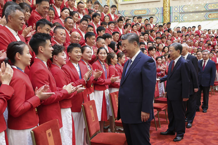 在热烈的掌声中,习近平发表重要讲话。他表示,中国体育代表团的优异成绩,既是我国体育事业发展进步的集中体现,也是中国式现代化建设成就的一个缩影,充分彰显了新时代中国力量。国运兴则体育兴、国家强则体育强。我国能够跻身世界体育大国、奥运强国之列,根本在于综合国力不断增强,为体育竞技训练提供了先进科技支撑和坚实物质保障,也为各领域体育人才脱颖而出创造了良好成长环境和广泛群众基础。新时代新征程,以中国式现代化全面推进强国建设、民族复兴伟业,必将为我国体育事业发展提供更好条件、注入强劲动力。我们要继续大力发展以人民为中心的体育事业,推动全民健身和全民健康深度融合,向着建设体育强国、健康中国的目标不断迈进。