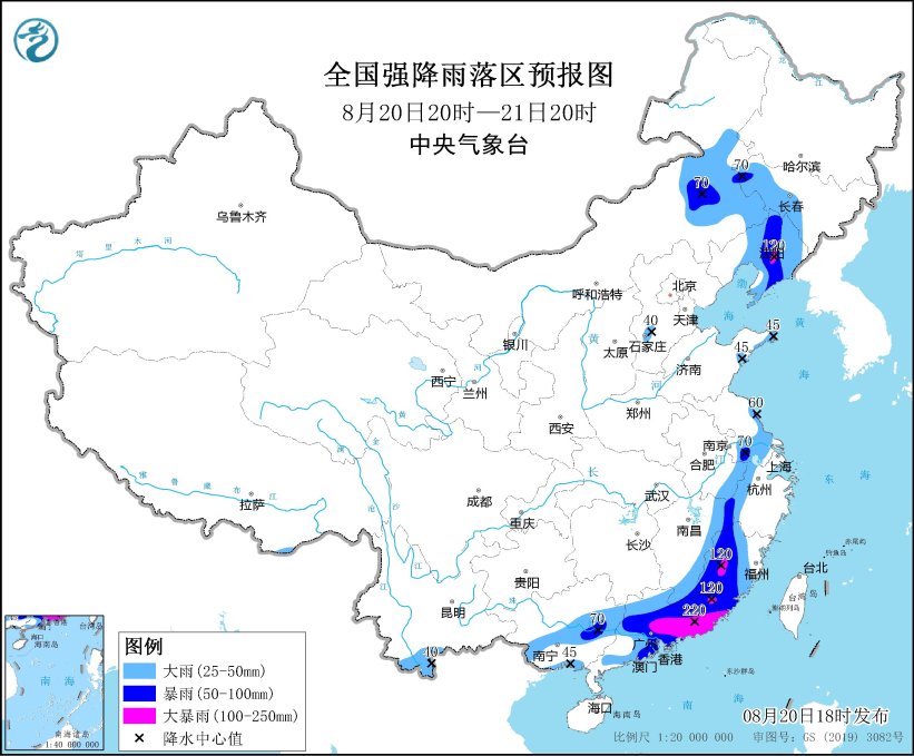 中央气象台8月20日18时继续发布暴雨黄色预警:预计,8月20日20时至21日20时,内蒙古东部偏南地区、辽宁中东部、吉林西部、河北中部、山东半岛南部、江苏东部和南部、安徽东南部、浙江西部、江西东部和南部、福建、广东、广西东部和南部、云南南部等地的部分地区有大到暴雨,其中,广东中东部、福建南部和西部、辽宁中部等地局地有大暴雨(100~220毫米)。上述部分地区伴有短时强降水(最大小时降雨量30~60毫米,局地可超过80毫米),局地有雷暴大风等强对流天气。