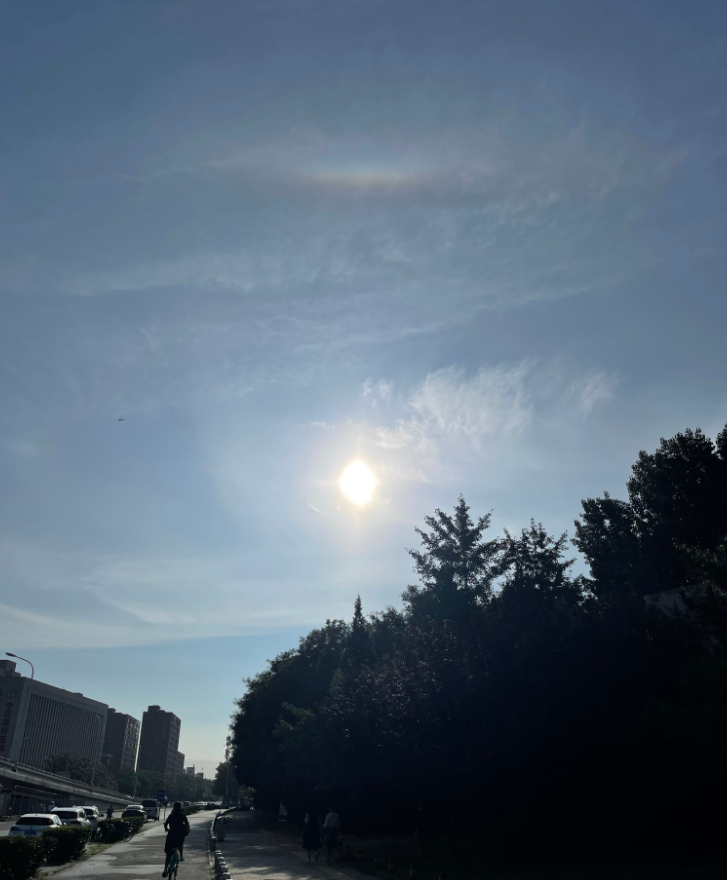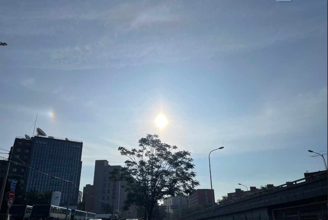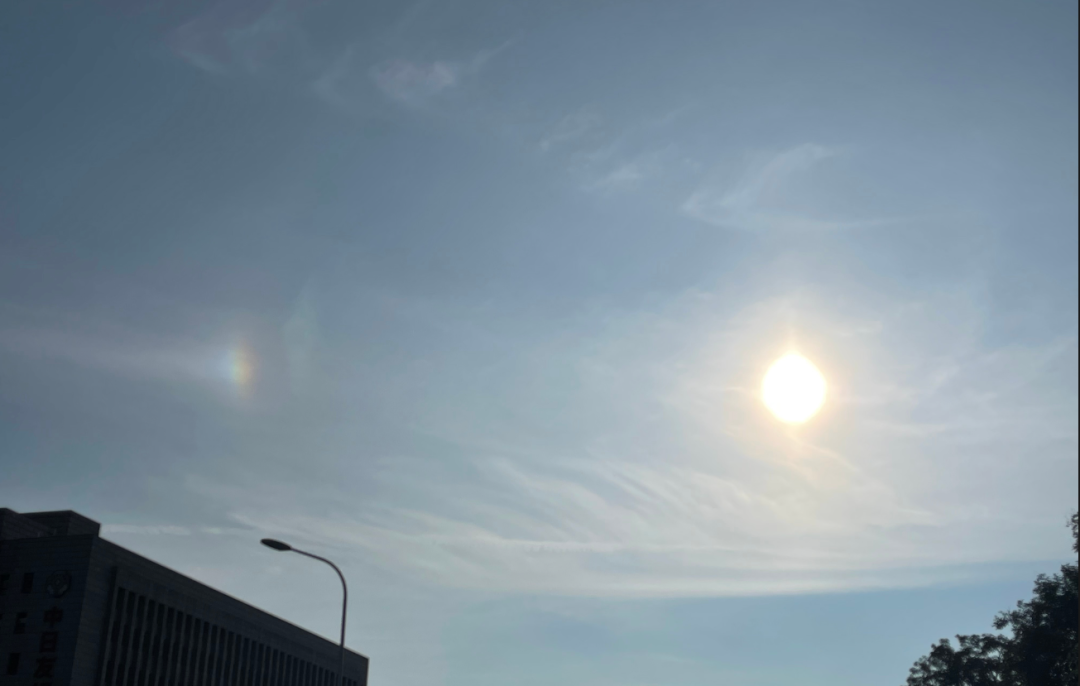 新京报讯 据@中国天气 官博消息,今天(8月21日)早晨,北京天空同时出现幻日和环天顶弧奇观。