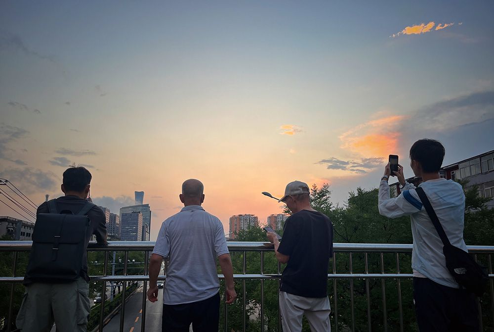 朝阳路,下午7时许,市民在天桥上拍摄雨后美丽的晚霞。
