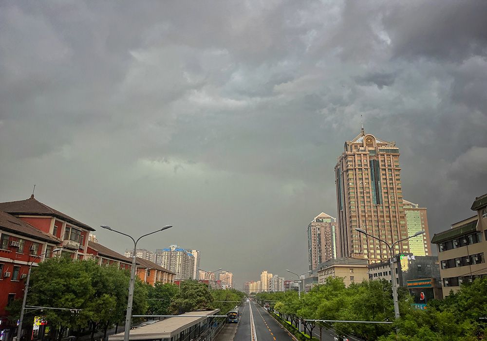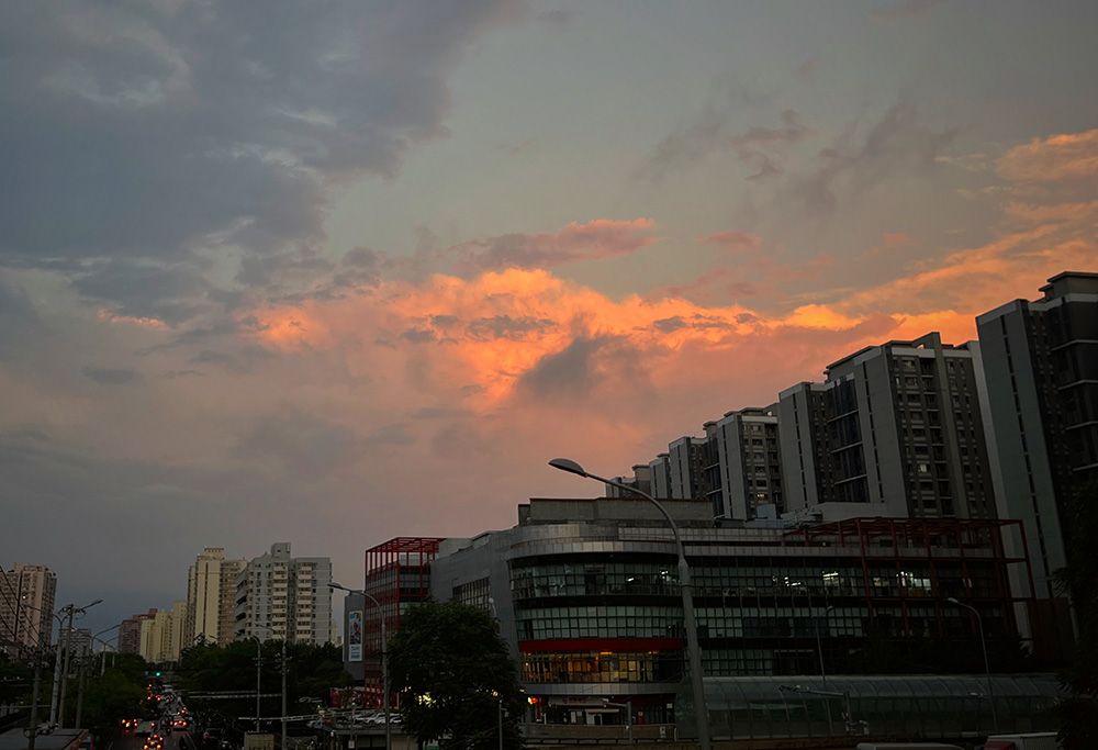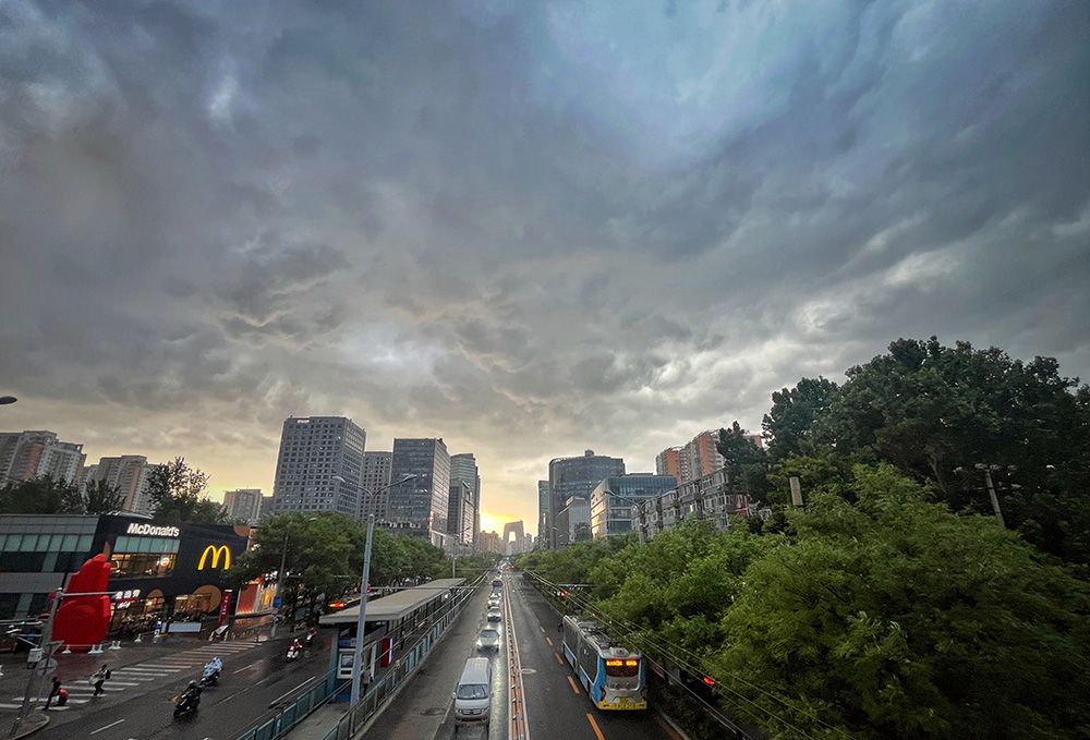 8月23日,阵雨过后,北京出现美丽晚霞。北京市气象台23日17时发布:今天傍晚至夜间阴有雷阵雨转多云,南风三级,局地阵风七级转北风一级,最低气温24℃;明天白天多云转阴有分散性雷阵雨,北转南风二三级,最高气温32℃。傍晚至前半夜有雷阵雨,局地短时雨强较大,伴有短时大风,晚高峰出行注意防雷避雨和交通安全。图为朝阳路,下午6时,向西望去,风起云涌。