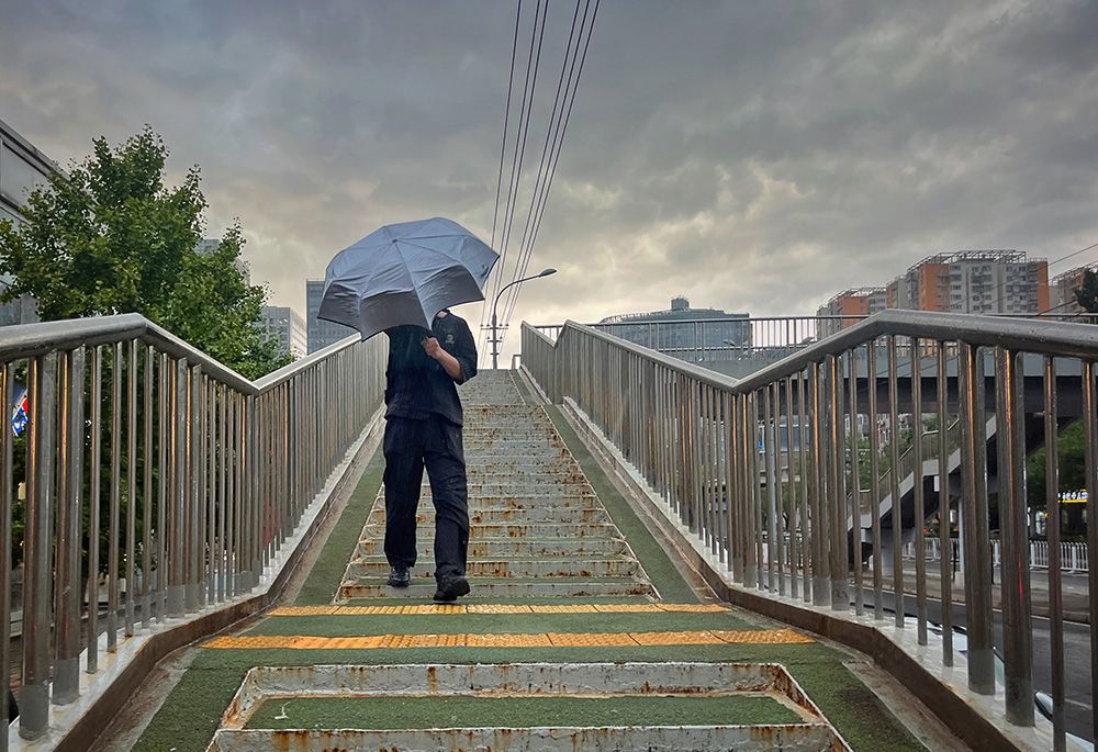朝阳路,下午6时许,一位市民撑伞走在雨中。