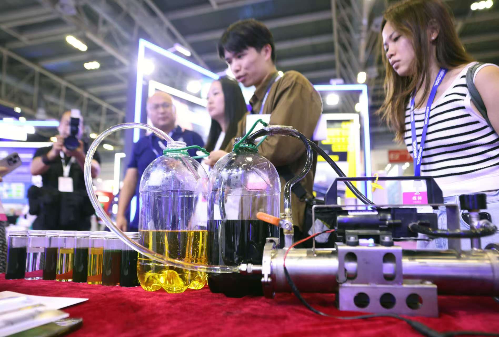 在优秀项目展区,观众在参观参赛企业研发的纳米超洁筛分净化装置。