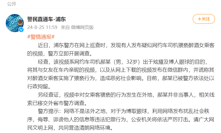 新京报讯 据@警民直通车-浦东 消息,近日,浦东警方在网上巡查时,发现有人发布疑似网约车司机猥亵醉酒女乘客的视频,警方立即开展调查。