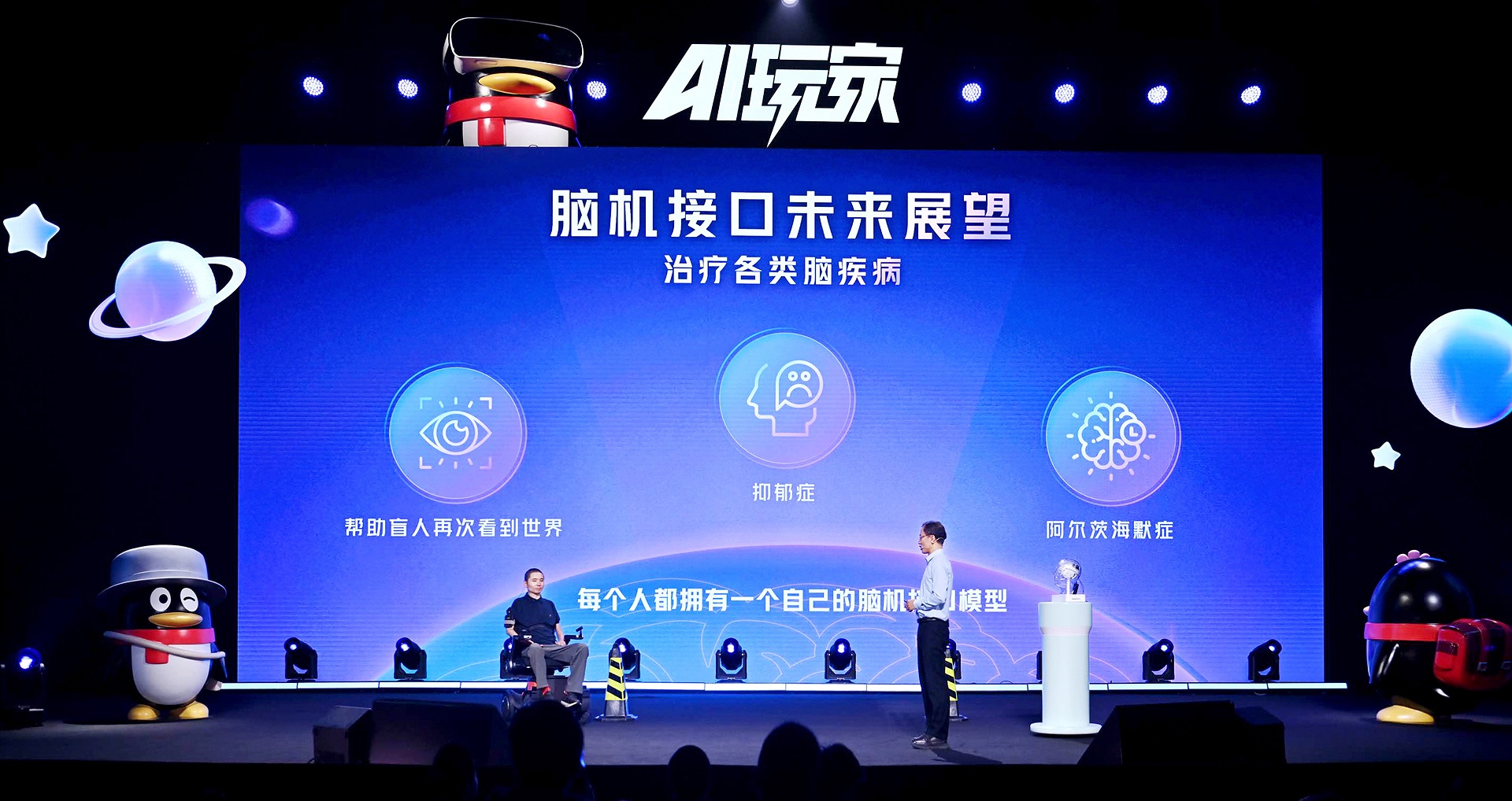 洪波教授与无线微创植入脑机接口NEO受试者之一互动。主办方供图