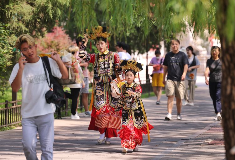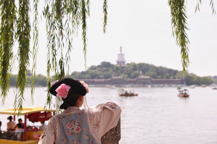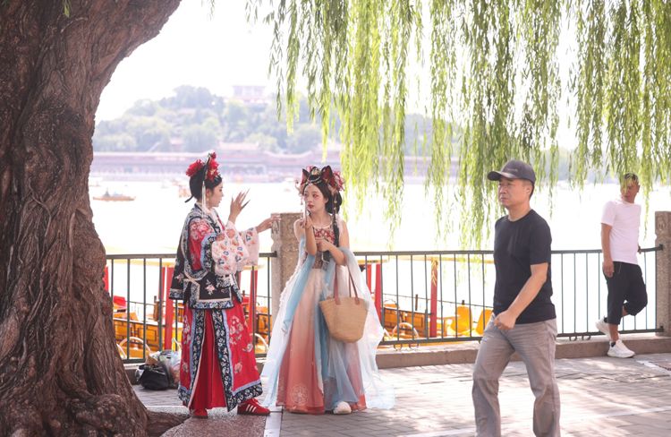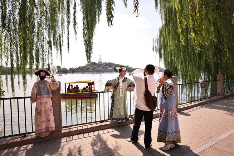 8月28日,北京天气晴朗,北海公园景色怡人。身着格格装的游客成为北海公园内一道流动的风景。