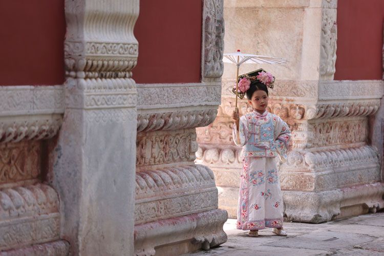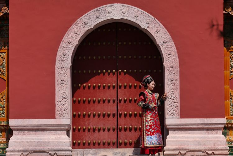 庄重华丽的清制旗装与古色古香的环境相得益彰。
