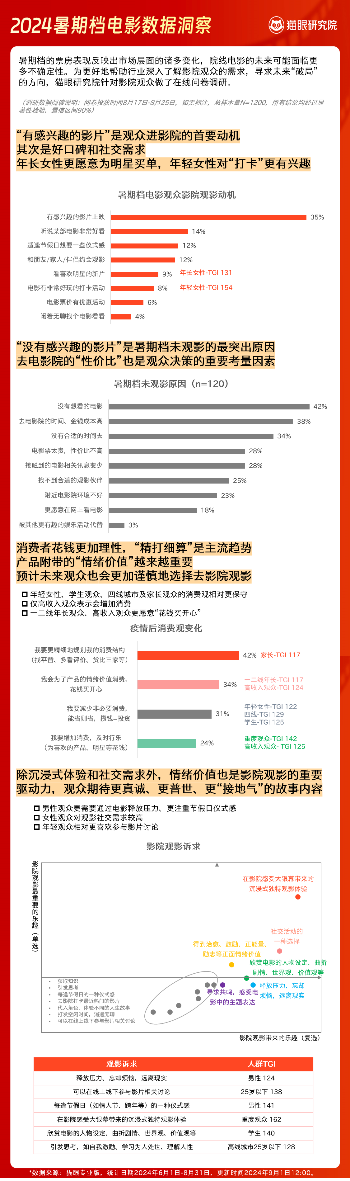 基于今年暑期档的市场表现,行业也面临着一系列不确定性。为更好服务行业,帮助从业者了解消费者需求、把握破局方向,猫眼研究院针对影院消费者进行了在线问卷调查。调研显示,“有感兴趣的影片”是观众走进影院的首要动机,若没有钟爱影片,观众对花销及时间的“性价比”和“性时比”(指对时间的有效利用)便尤为看重。相比于其他视听媒介,影院大银幕对于消费者的价值,主要在于提供沉浸式观影体验、作为社交活动场景,观众希望在影院里释放压力、得到治愈,收获情绪价值。