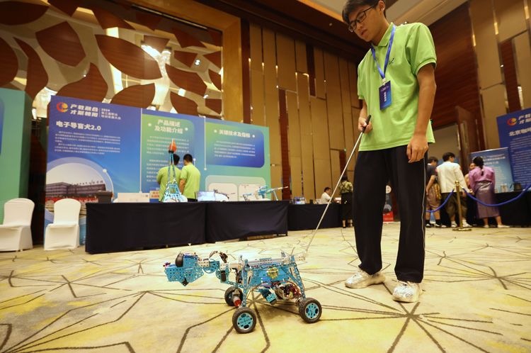 大会启动 “百企万员” 技能培训专项行动,30余家校企现场达成合作意向。图为北京市电子工程学校展示电子导盲犬。
