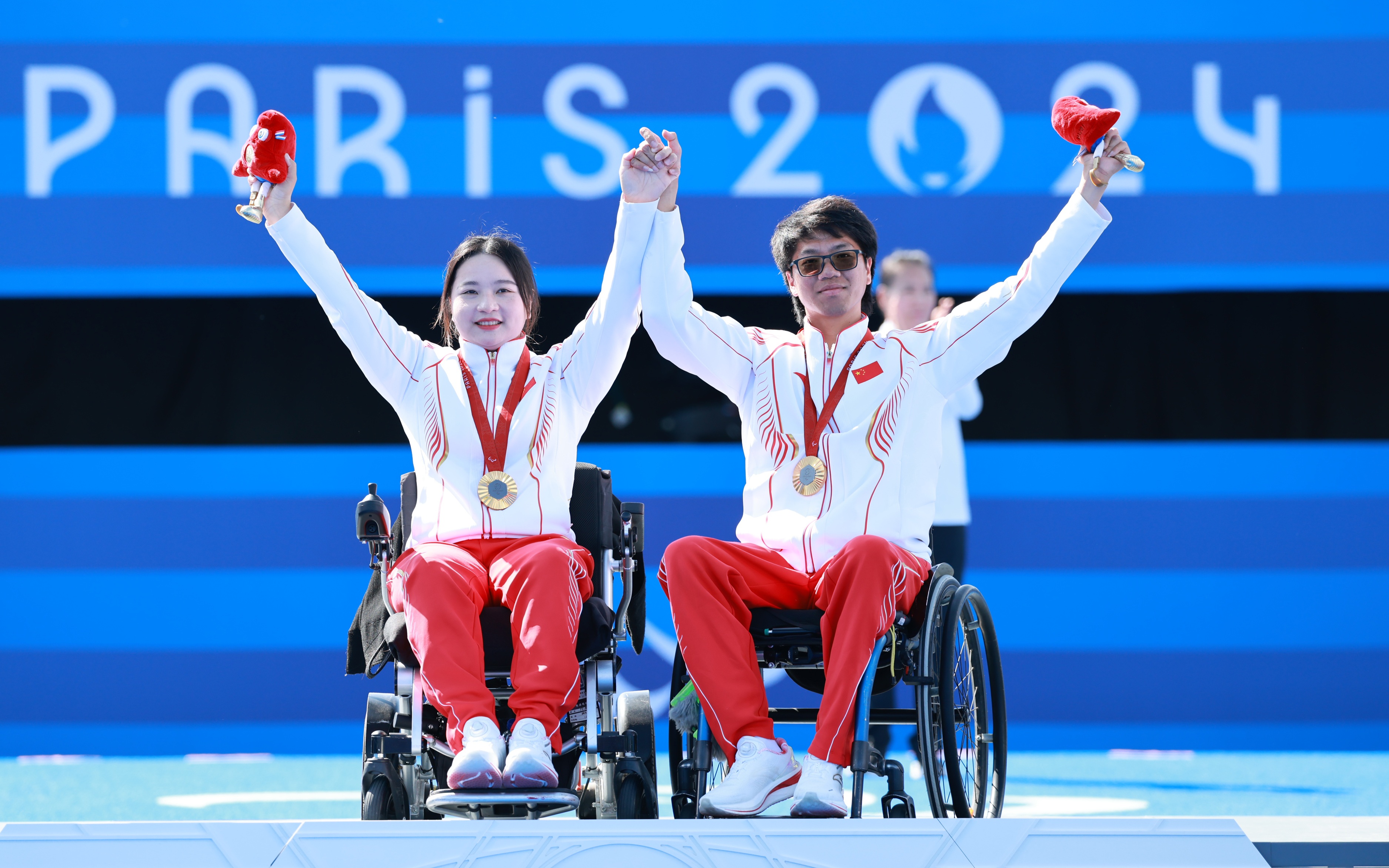 中国组合陈敏仪(左)/张天鑫夺得巴黎残奥会射箭混合团体W1级金牌。 图/新华社