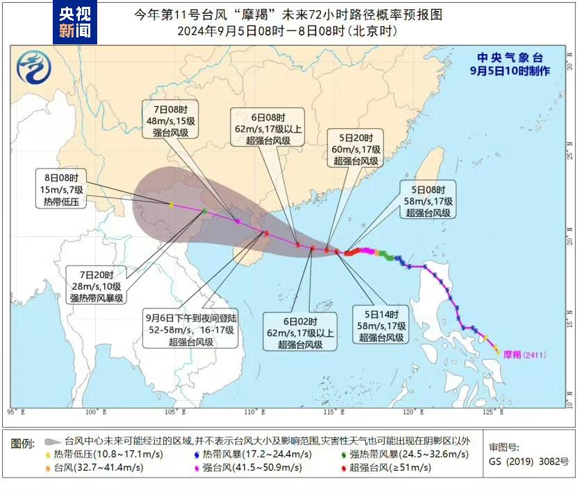 据央视新闻消息,9月5日10时,中央气象台发布台风红色预警,台风“摩羯”将于6日下午至夜间在海南琼海到广东电白一带沿海登陆(超强台风级,16级—17级)。