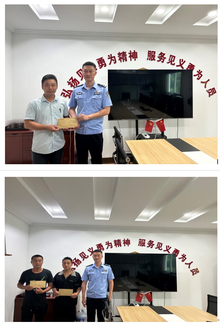 江苏省常州市新北区见义勇为基金会百丈工作站站长、派出所教导员王成成对此前见义勇为的刘龙龙、庞展展、肖班全3人慰问,并颁发奖金。受访者供图