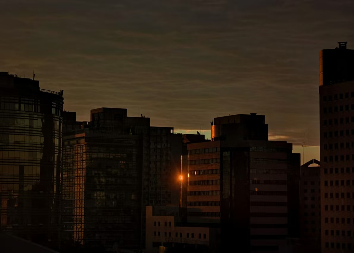 楼宇缝隙反射出逐渐升起的太阳。