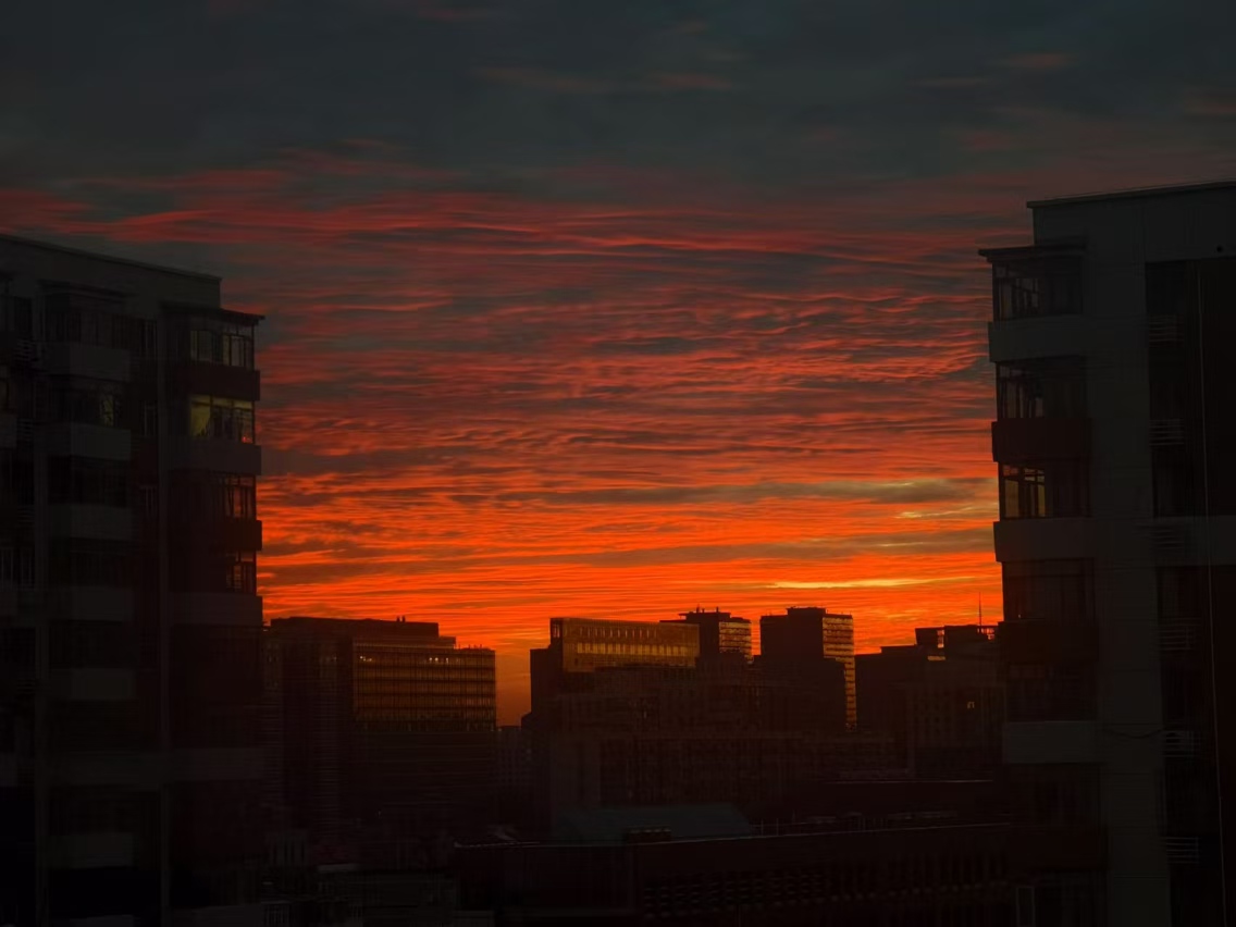 日出东方:北京火红朝霞映照天际