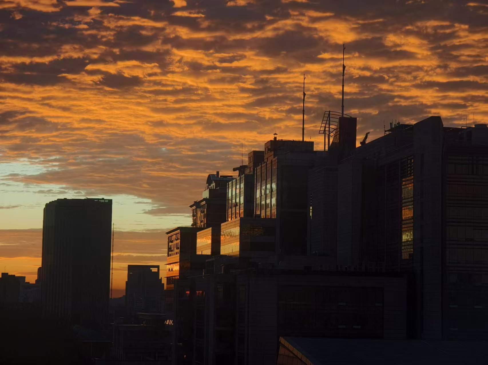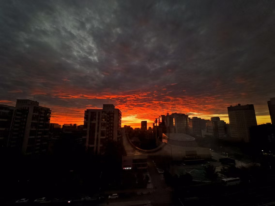 9月6日5时许,海淀黄庄向东望去,天边出现绚丽的火烧云。