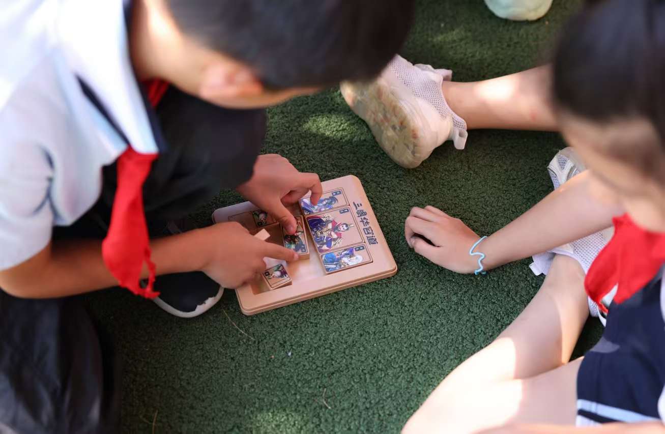 小学生席地而坐玩起了“华容道”游戏。