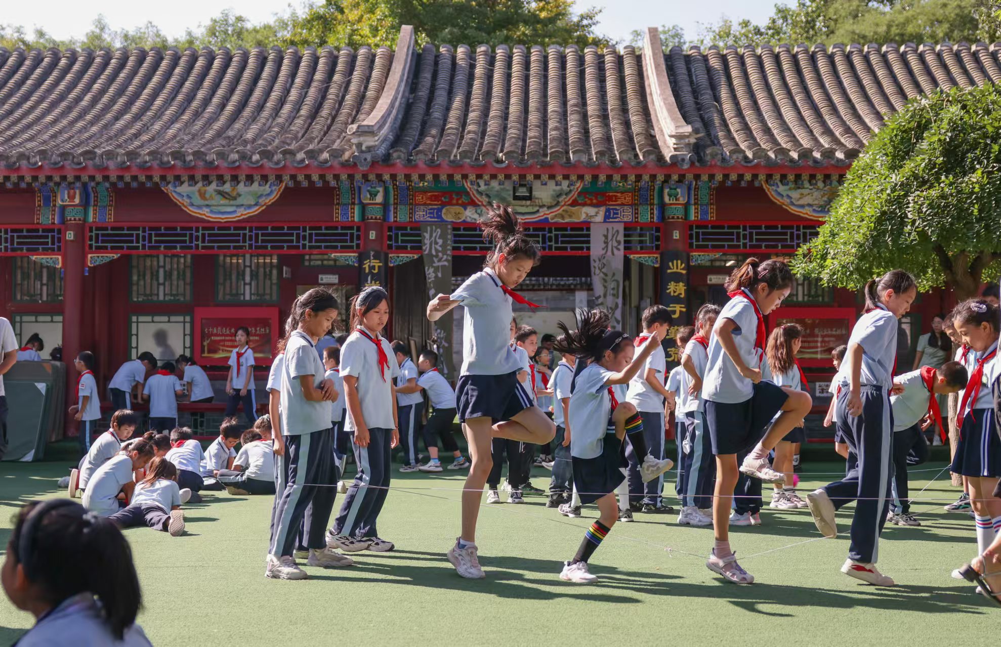 女生们在跳皮筋。