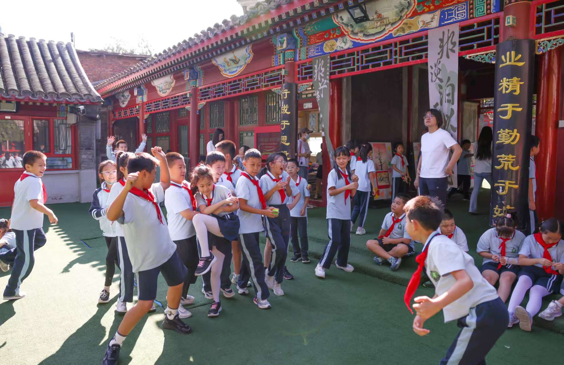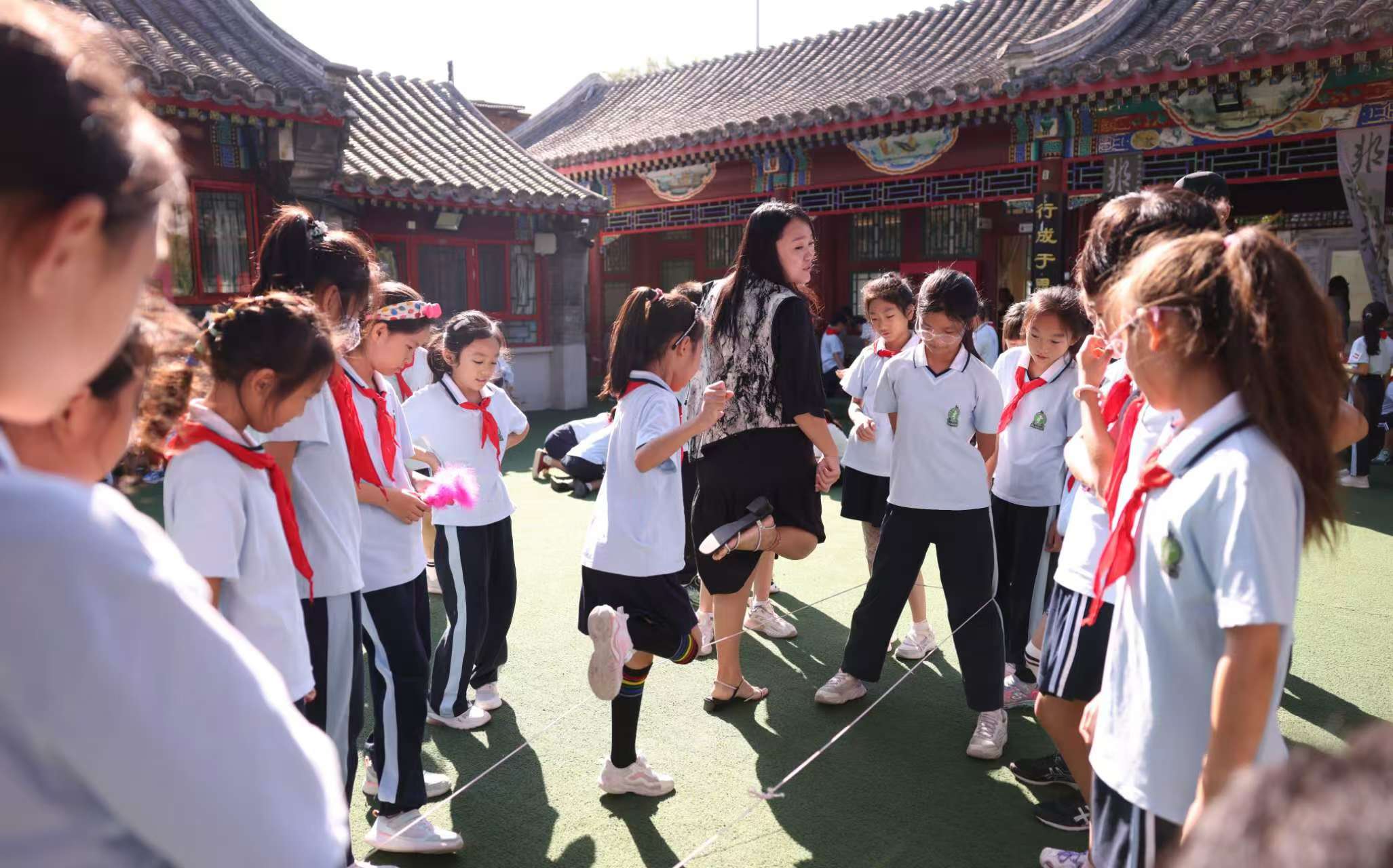 老师在和小学生一起玩游戏。该校在充分调研家长和学生需求意见的基础上,结合校园布局和学生学段特点,开展体育小游戏、弟子规操、集体舞等丰富多样的课间活动。