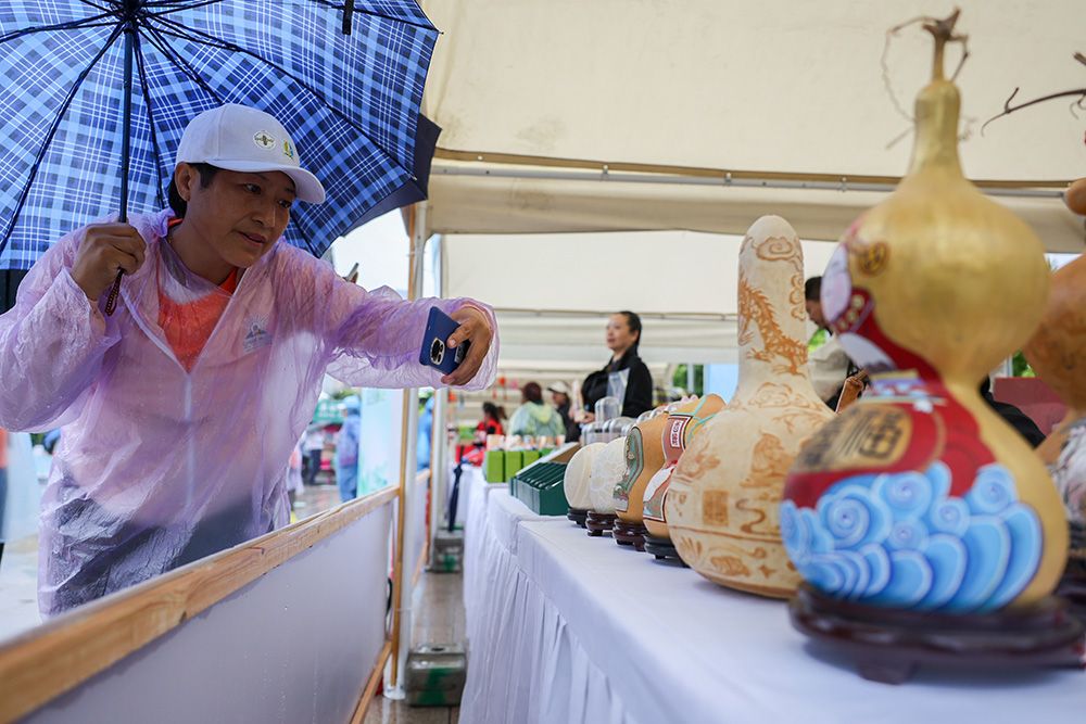 非遗展示区,徒步爱好者拍摄葫芦雕刻作品。