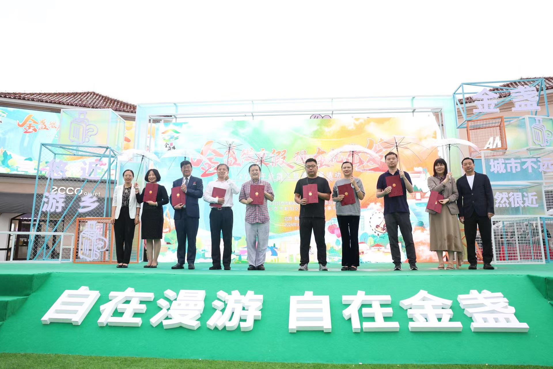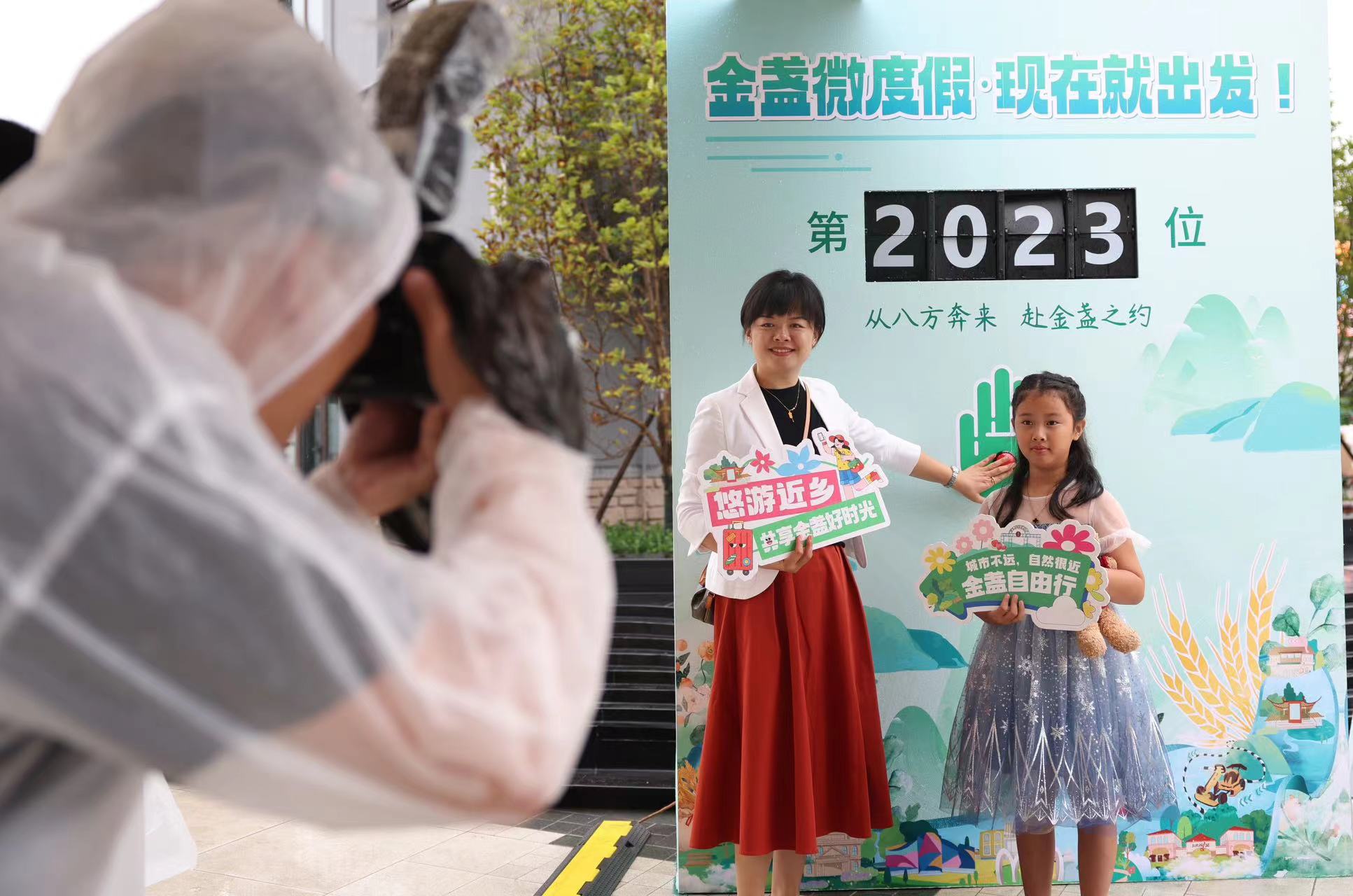 9月7日,2024年金盏文旅季在斯普瑞斯奥莱开幕,金盏乡携手辖区十大文旅点位,发布地区文旅地图,以及“农旅、文体、商旅”三条文旅线路。图为市民在打卡处拍照留念。