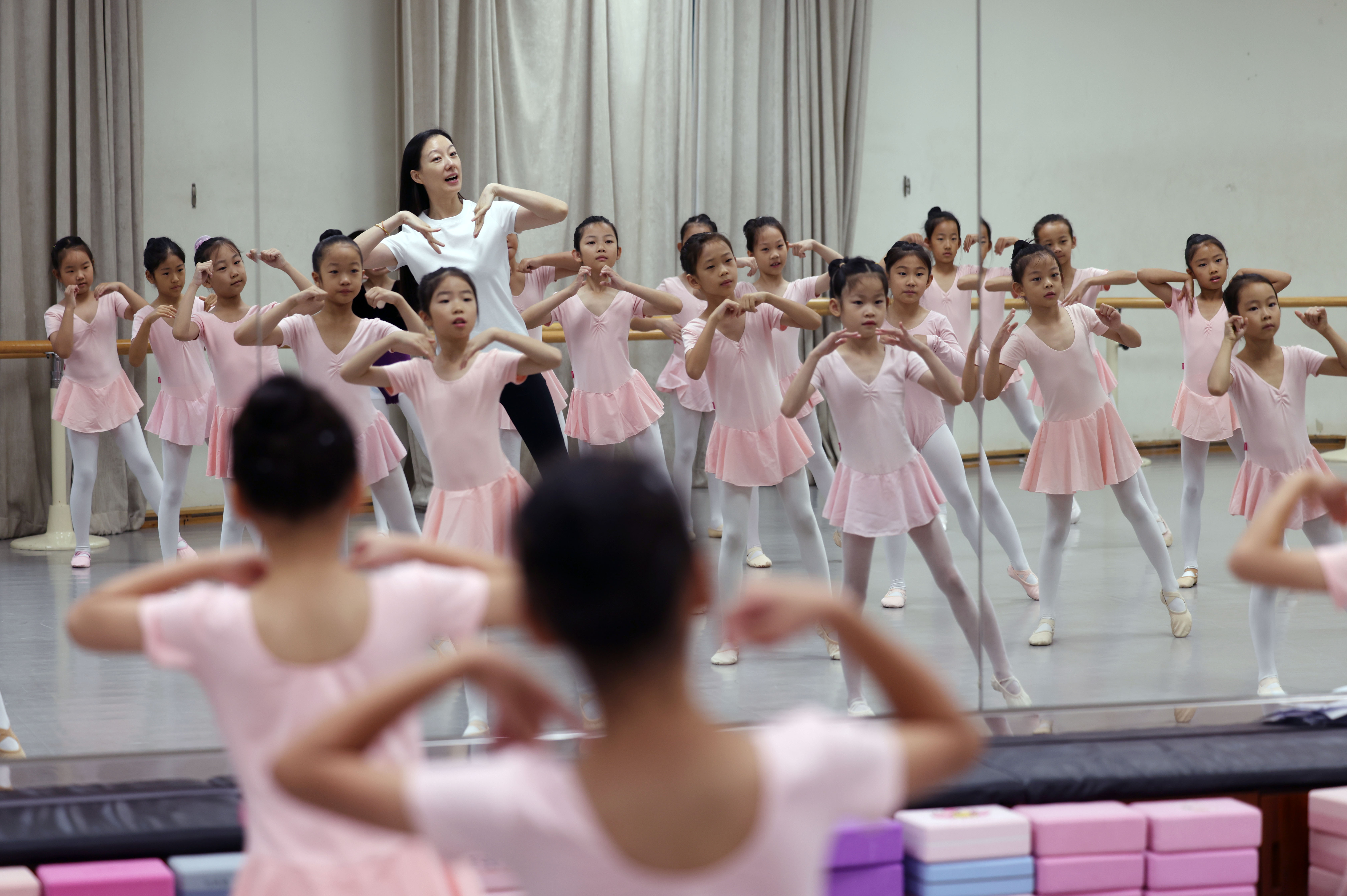 舞蹈教室里,学员们身穿练功服,在老师的指导下进行练习。新京报记者 李木易 摄