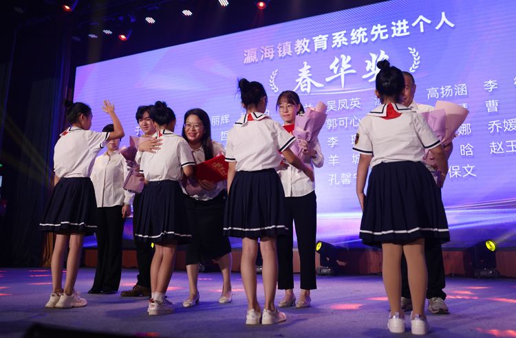 学生为获奖教师敬献鲜花。据悉,为庆祝第四十个教师节,瀛海镇推出了“四个一”系列活动。其中包括这场文艺汇演暨表彰盛典,此外还举办了一场师生参与的主题书画展;为见证瀛海教育发展四十年的老师拍摄了系列视频片;同时邀请瀛海40名师生共同创作了一本《瀛海教育 四十不惑》的书。