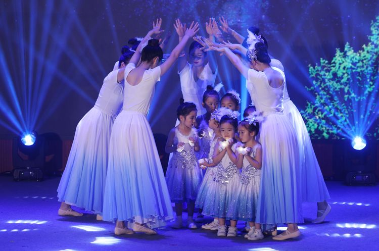 幼儿园的小朋友和老师表演舞蹈《夜空中最亮的星》。