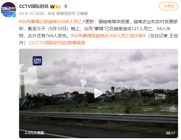 据CCTV国际时讯微博消息,据越南媒体报道,越南农业和农村发展部称,截至今天(9月10日)晚上,台风“摩羯”已在越南造成127人死亡、54人失踪,此外还有764人受伤。