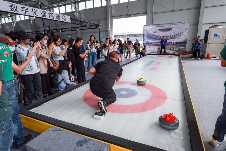 首钢园8号馆,体育服务专题展馆,工作人员展示国产的冰壶道。