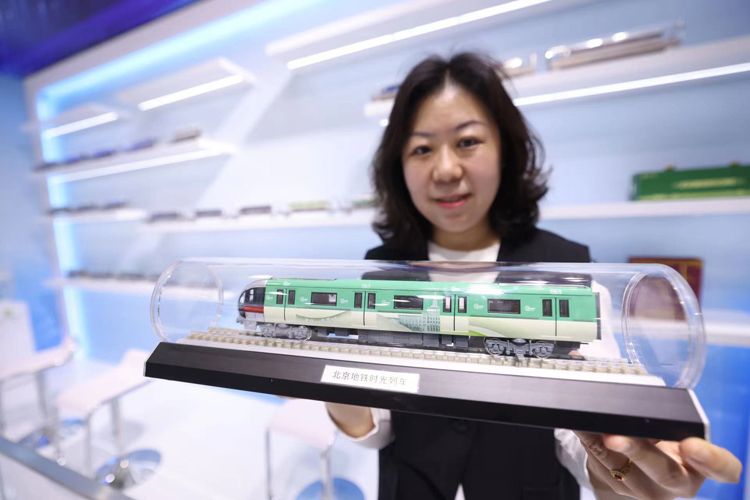 在出行服务专区,北京地铁展示多项便民服务举措,包括提升出行体验和打造轨道都市生活方面的措施。图为工作人员展示地铁时光列车模型。