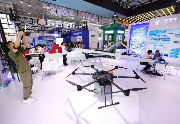 智慧物流及运输专区聚焦行业热点,一批快递企业展示物流配送无人机等高新技术产品。图为中国邮政展示的无人机。