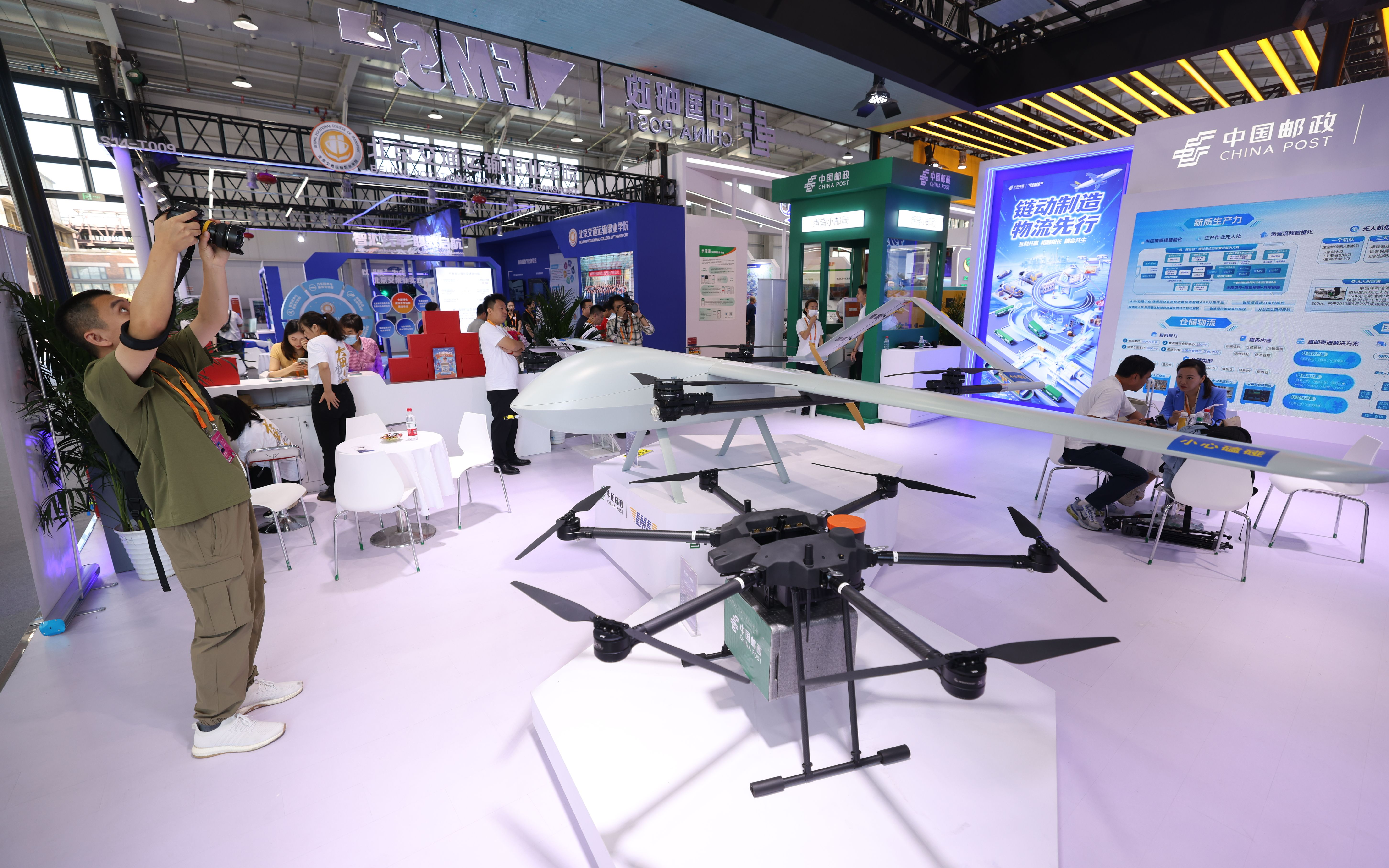 特别是在智慧物流及运输专区,由中国快递协会牵头组织的中国邮政速递物流(EMS)、顺丰、中通、圆通、韵达、申通以及菜鸟等7家快递企业组团亮相,以“新质生产力,智领快递新未来”为主题,集中展示快递行业无人机、无人配送车、楼宇机器人、盘点小车、智慧灯条等高新技术产品,致力于构建数智化供应链生态,为全球客户和消费者带来安全、高效、便捷的快递服务。