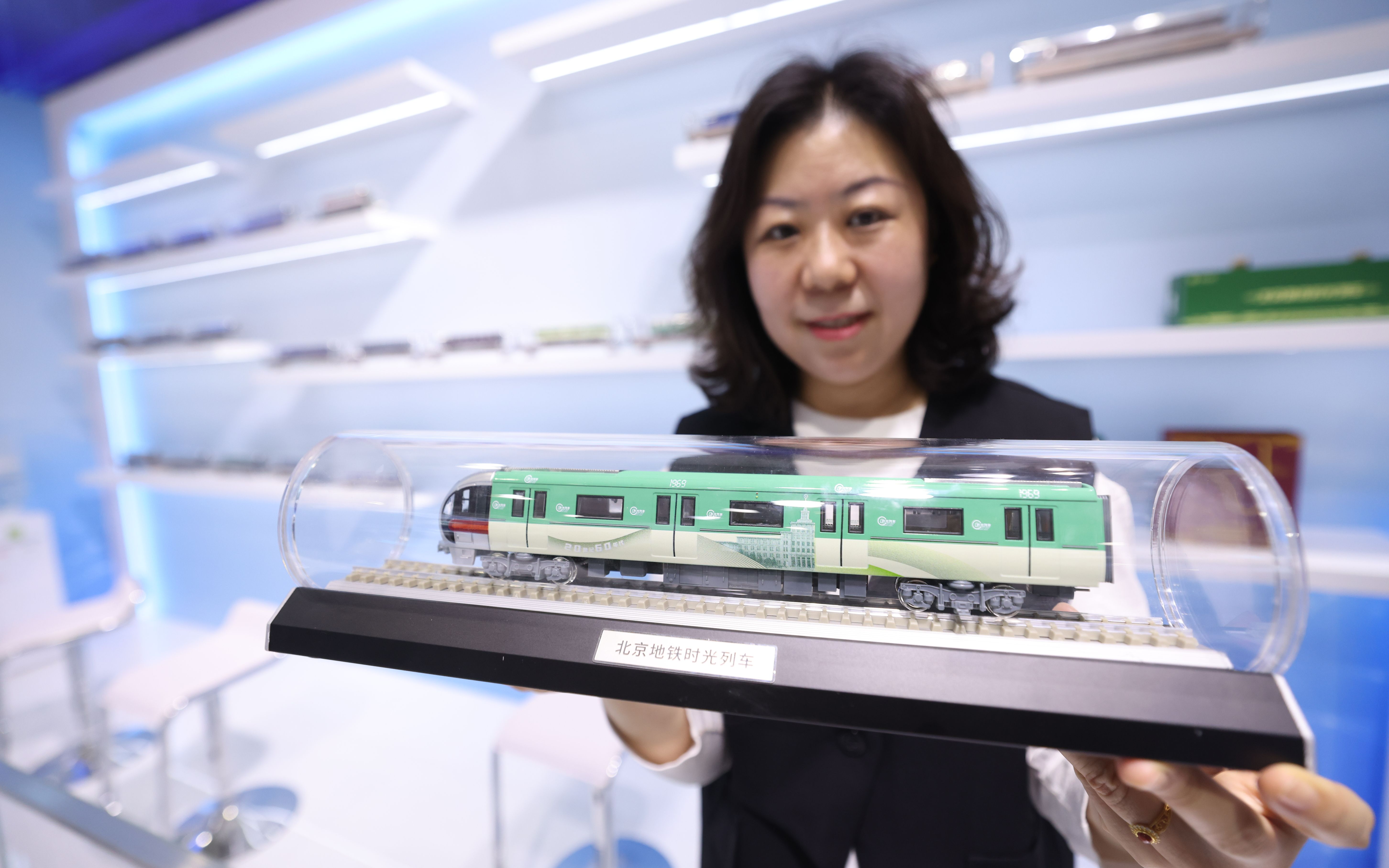 北京地铁展区,工作人员展示地铁时光列车模型。新京报记者 王贵彬 摄