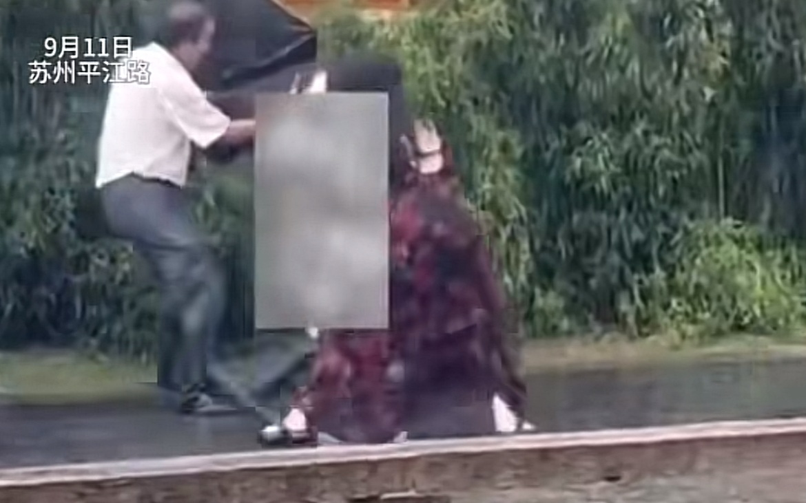 ▲9月11日,江苏苏州平江路一男子持刀伤人,一名穿碎花裙的女生用伞奋力敲打行凶者。图/网络视频截图