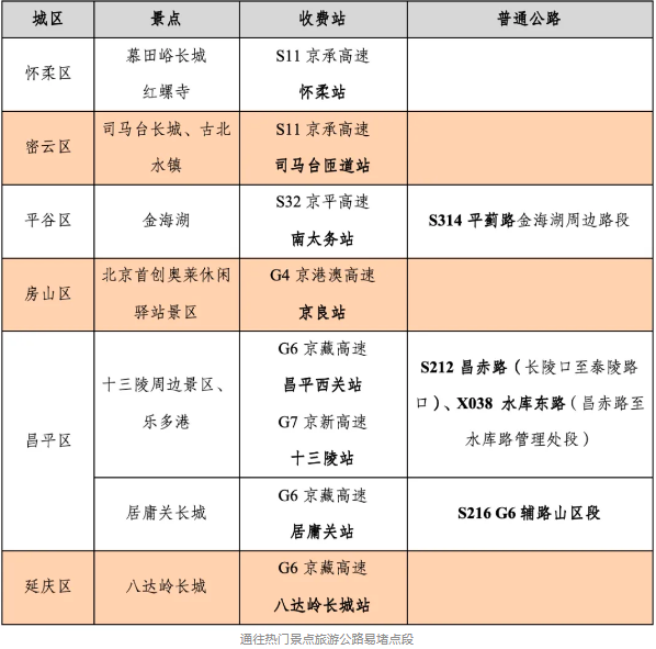 节日期间,通往热门景点的旅游路线关键点段,高峰时刻将会出现短时车流集中情况。车流量增幅明显的点、段有: