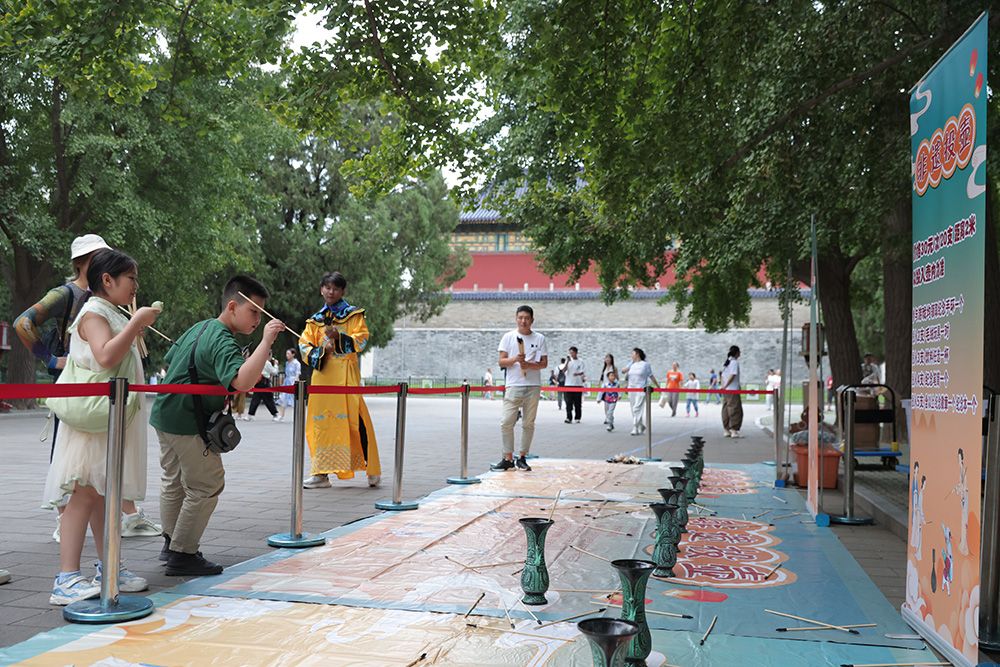 为了提升游客赏月的体验感和趣味性,中秋假期,全新升级的“月满中秋 天坛雅集”夜市将正式亮相。在“月满中秋 天坛雅集”夜市上,游客市民将有机会亲身体验朱炳仁大师的非遗铜器制作技艺,感受千年传承的匠心独运;还可以参与到射箭、投壶等互动游戏中,品味古代士人的风雅之趣;更有花灯、漆扇制作等体验活动,让游客市民收获一份亲手制作的中秋佳节装饰。图为游客体验投壶。