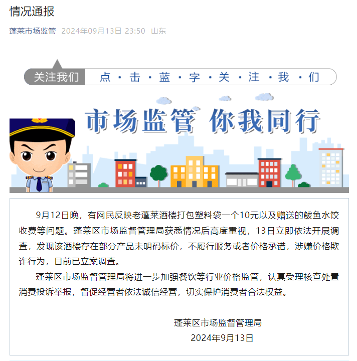新京报讯 据蓬莱市场监管官微消息,9月12日晚,有网民反映老蓬莱酒楼打包塑料袋一个10元以及赠送的鲅鱼水饺收费等问题。蓬莱区市场监督管理局获悉情况后高度重视,13日立即依法开展调查,发现该酒楼存在部分产品未明码标价,不履行服务或者价格承诺,涉嫌价格欺诈行为,目前已立案调查。