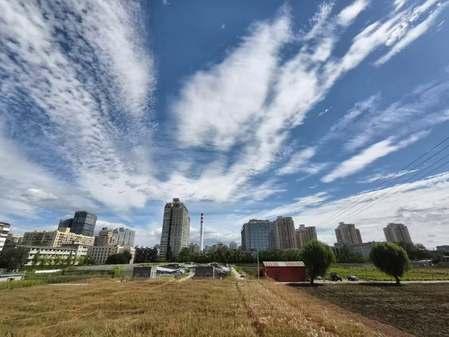 中关村东路,白云从天际线向四周散射。