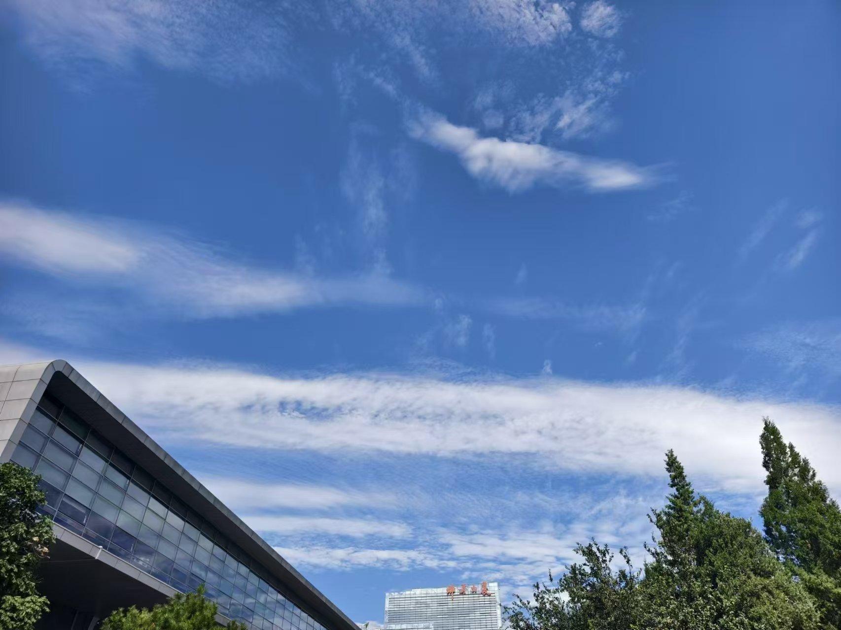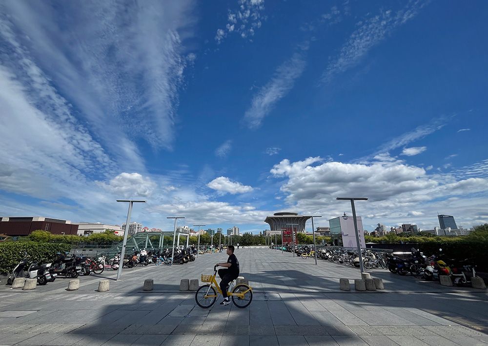 中关村东路,白云在蓝天上变化着各种形状。