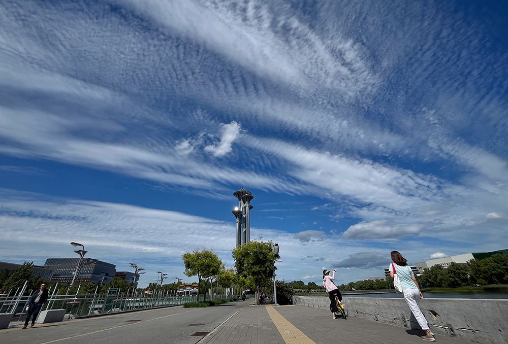 9月14日中午,奥林匹克公园中心区,蓝天白云美不胜收。北京市气象台14日11时发布天气预报:今天下午多云间晴,北风三级(阵风五级)转南风一级,最高气温25℃;夜间多云,南转北风一二级,最低气温16℃。