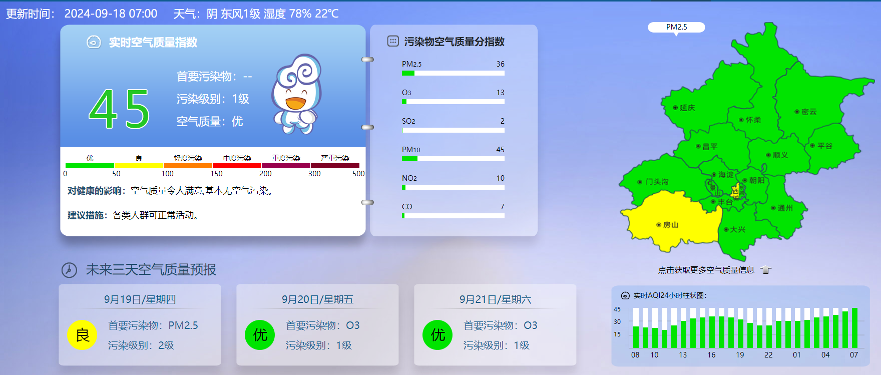 据北京市生态环境监测中心今早7时数据,目前实时空气质量指数45 ,污染级别1级,空气质量优。