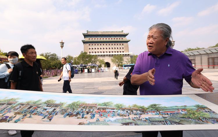 9月19日,前门大街,京味儿画家杨信向游客介绍前门附近的北京老字号历史。
